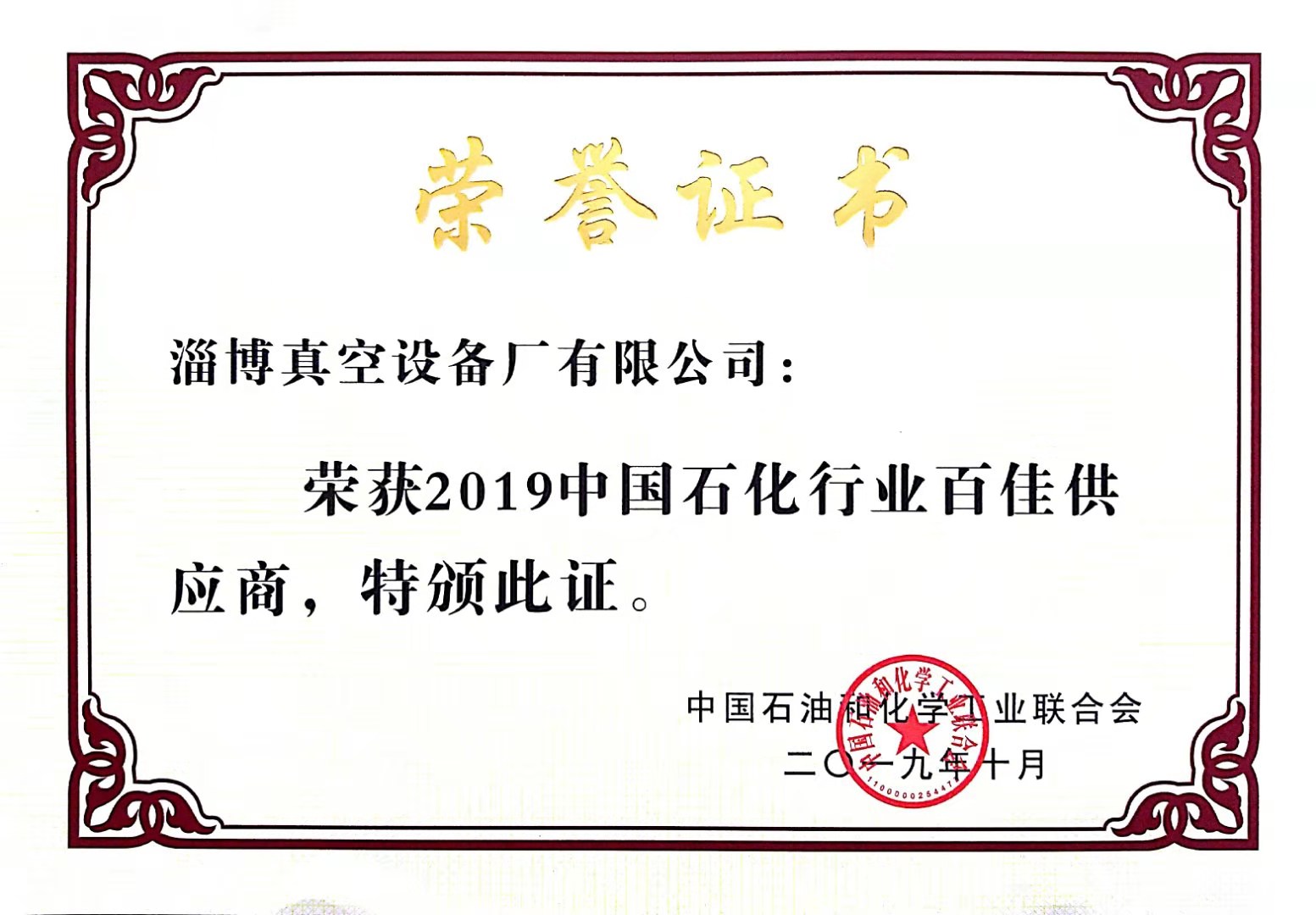 【理事单位风采】淄博真空设备厂有限公司再次被评为石油和化工行业百佳供应商