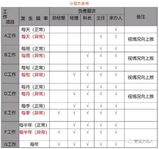 前文我们说到权力往往是和责任在一起的,所以分层负责也可以说是分层授权,负责任当然授权,不负责任授什么权。分层负责就是把责任一层一层的分割,然后给到应该拿到这个责任的员工,按照什么分割呢?所以我们给到大家一个非常重要的表格: