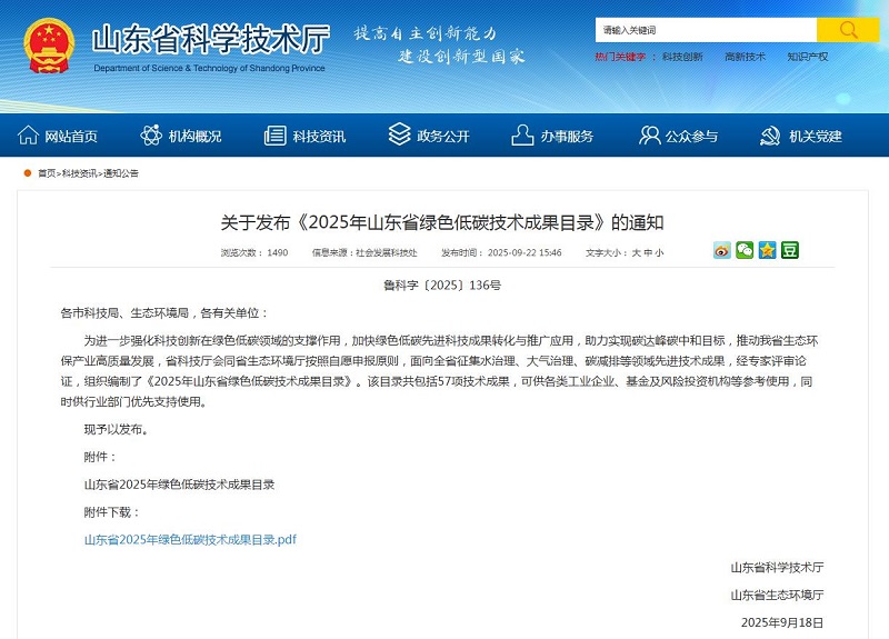 山东省科学技术厅:关于发布《2025年山东省绿色低碳技术成果目录》的通知