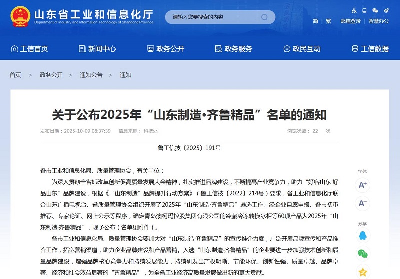 鲁工信技〔2025〕191号 各市工业和信息化局、质量管理协会,有关单位: 为深入贯彻全省抓改革创新促高质量发展大会精神,扎实推进品牌建设,不断提高产业竞争力,助力“好客山东 好品山东”品牌建设,根据《“山东制造”品牌提升行动方案》(鲁工信技〔2022〕214号)要求,省工业和信息化厅联合山东广播电视台、省质量管理协会组织开展了2025年“山东制造·齐鲁精品”遴选工作。经企业自愿申报、各市初审推荐、专家论证、网上公示等程序,确定青岛澳柯玛控股集团有限公司的冷藏冷冻转换冰柜等60项产品为2025年“山东制造·齐鲁精品”,现予公布(名单见附件)。 各市工业和信息化局、质量管理协会要加大对“山东制造·齐鲁精品”的宣传推介力度,广泛开展品牌宣传和产品推介工作,拓宽营销渠道,助力企业品牌建设和产品营销。入选“山东制造·齐鲁精品”的企业要进一步加强技术创新和质量品牌建设,增强品牌核心竞争力和持续发展能力,持续研发出产权明晰、节能环保、创新性强、质量卓越、品牌卓著、经济和社会效益显著的“齐鲁精品”,为全省工业经济高质量发展做出新的更大贡献。 山东省工业和信息化厅 山东广播电视台 山东省质量管理协会 2025年9月30日 |