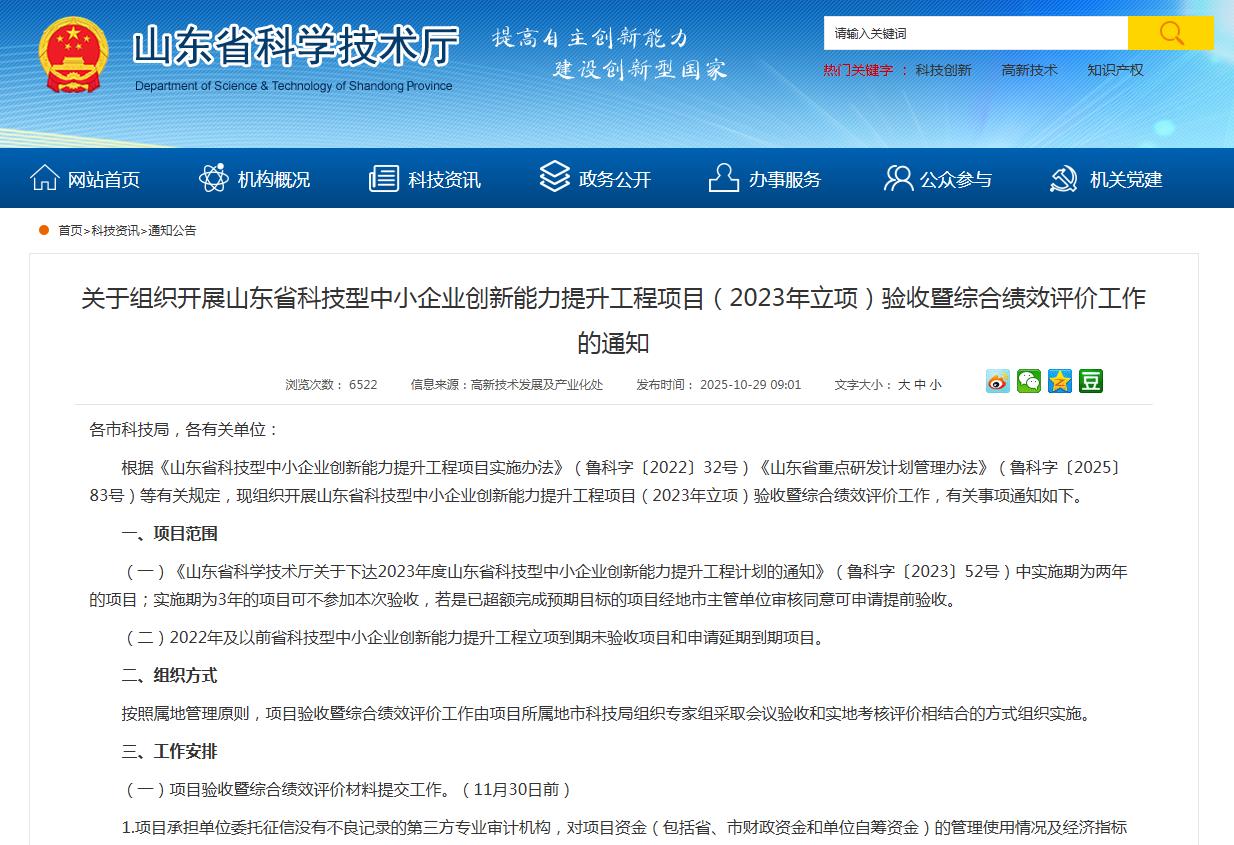 山东省科学技术厅:关于组织开展山东省科技型中小企业创新能力提升工程项目(2023年立项)验收暨综合绩效评价工作的通知