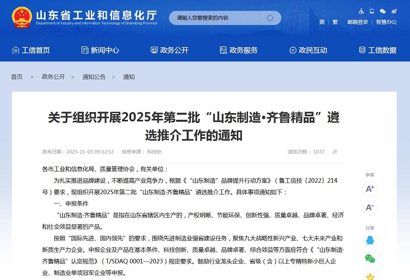 山东省工业和信息化厅:关于组织开展2025年第二批“山东制造·齐鲁精品”遴选推介工作的通知