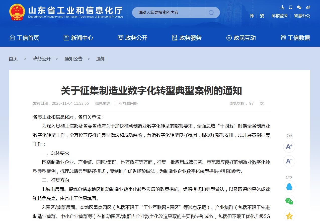 山东省工业和信息化厅:关于征集制造业数字化转型典型案例的通知
